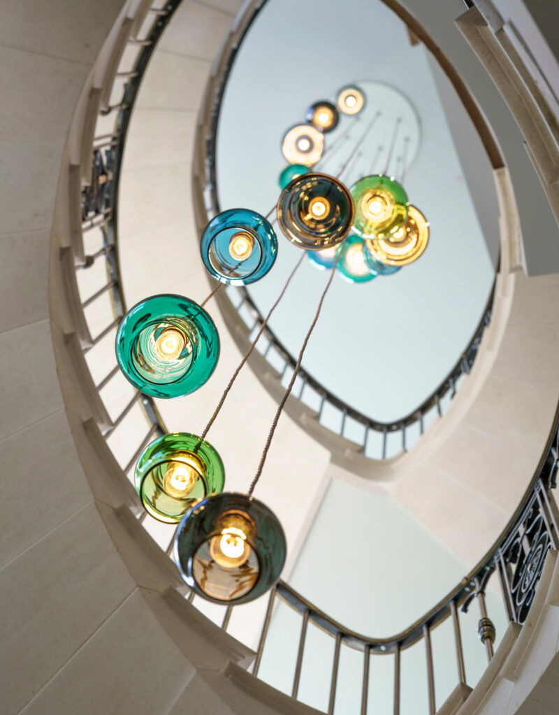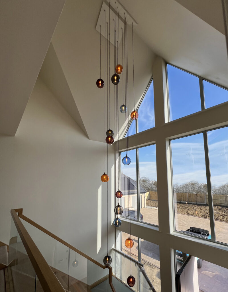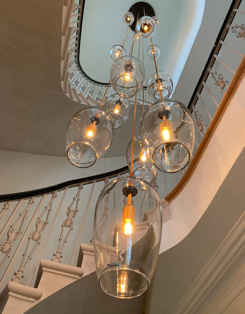 These installations features two distinctive chandelier designs, each showcasing a unique approach to bespoke lighting. One incorporates our Cocoon shades, elegantly cascading down the staircase to create a soft, sculptural flow of light.